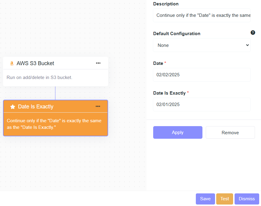 - Description: Continue only if the "Date" is exactly the same as the "Date Is Exactly."