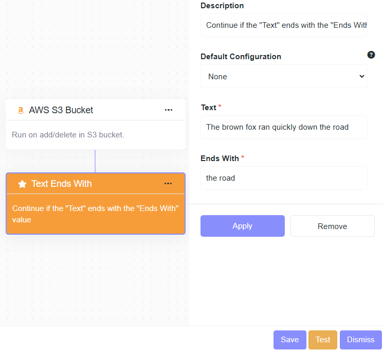 - Description: Continue if the "Text" ends with the "Ends With" value.