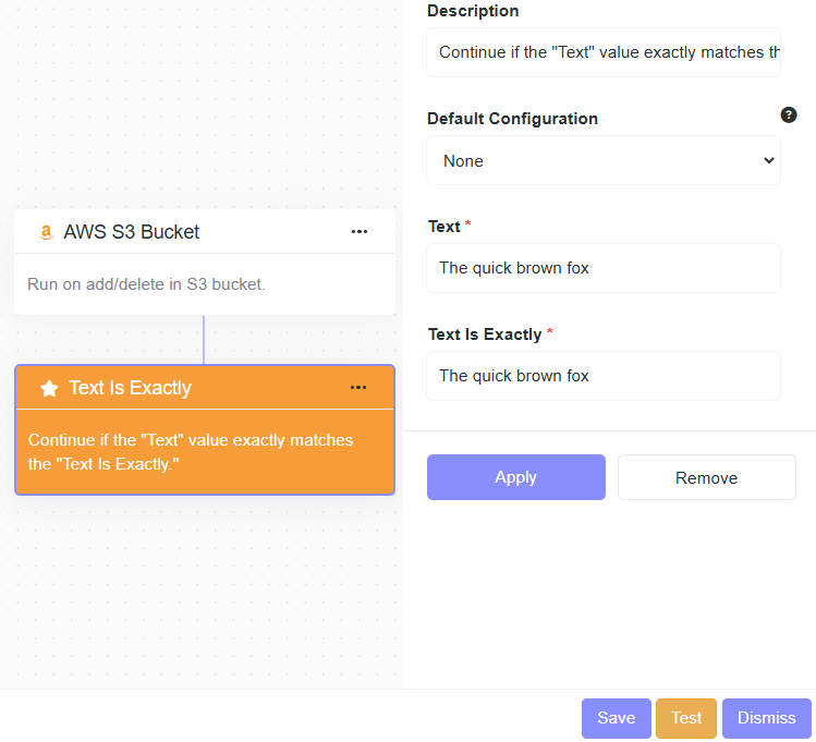 - Description: Continue if the "Text" value exactly matches the "Text Is Exactly".